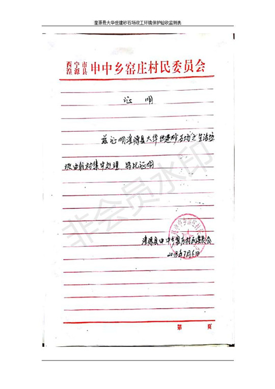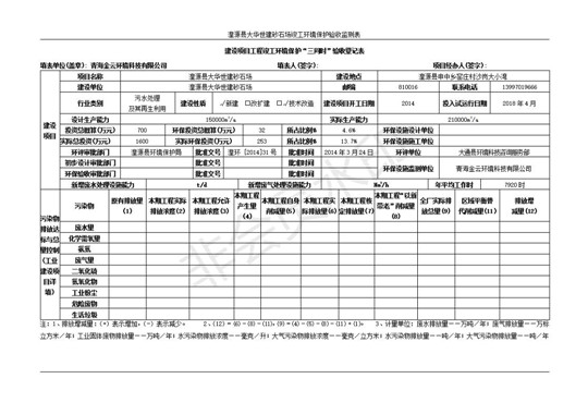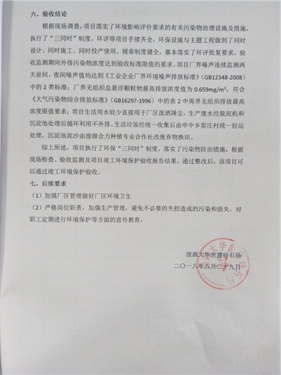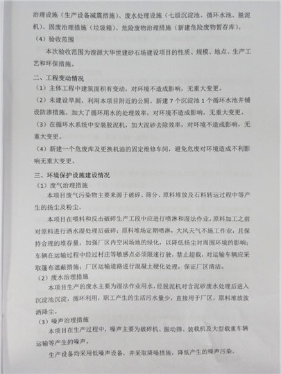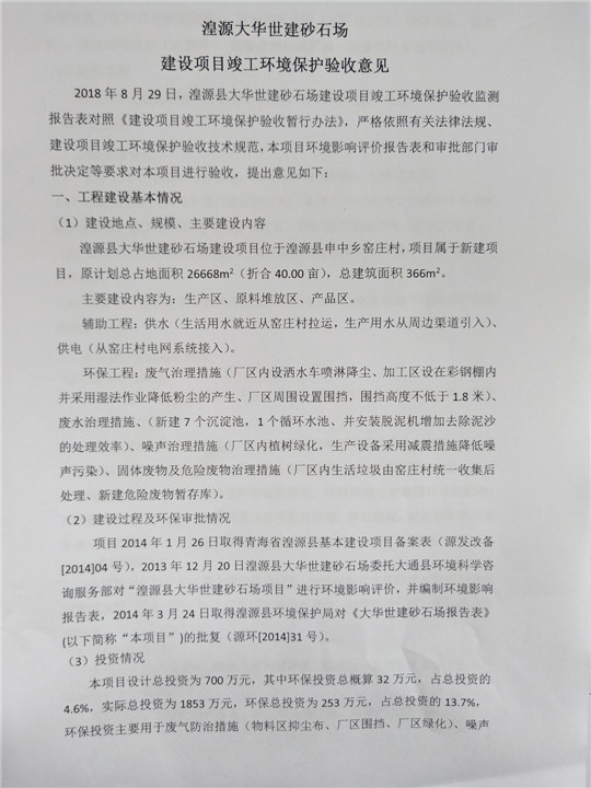 根據(jù)中華人民共和國國務(wù)院令第253號《建設(shè)項目環(huán)境保護(hù)管理條例》(中華人民共和國國務(wù)院令第682號《國務(wù)院關(guān)于修改〈建設(shè)項目環(huán)境保護(hù)管理條例〉的決定》和《建設(shè)項目竣工環(huán)境保護(hù)驗收暫行辦法》,嚴(yán)格依照有關(guān)法律法規(guī),建設(shè)項目環(huán)境保護(hù)設(shè)施驗收技術(shù)規(guī)范,本項目環(huán)評報告表和環(huán)保審批部門審批意見以及企業(yè)自行驗收相關(guān)要求等對本項目進(jìn)行驗收,本項目符合環(huán)保驗收條件,可以通過環(huán)保驗收。 湟源大華世建砂石場建設(shè)項目竣工環(huán)境保護(hù)驗收意見.