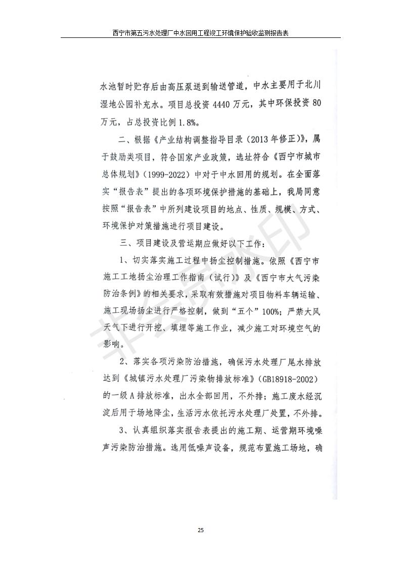 根據(jù)中華人民共和國國務院令第682號《國務院關于修改〈建設項目環(huán)境保護管理條例〉的決定》和《建設項目竣工環(huán)境保護驗收暫行辦法》(國務院令682號),西寧市第五污水處理廠中水回用工程建設項目(包括竣工環(huán)境保護驗收監(jiān)測報告表和驗收意見)公示如下。 一、項目名稱:西寧市第五污水處理廠中水回用工程建設項目 二、地點:西寧市城北區(qū)廿十里鋪雙蘇堡 三、建設單位:西寧市排水開發(fā)建設有限公司