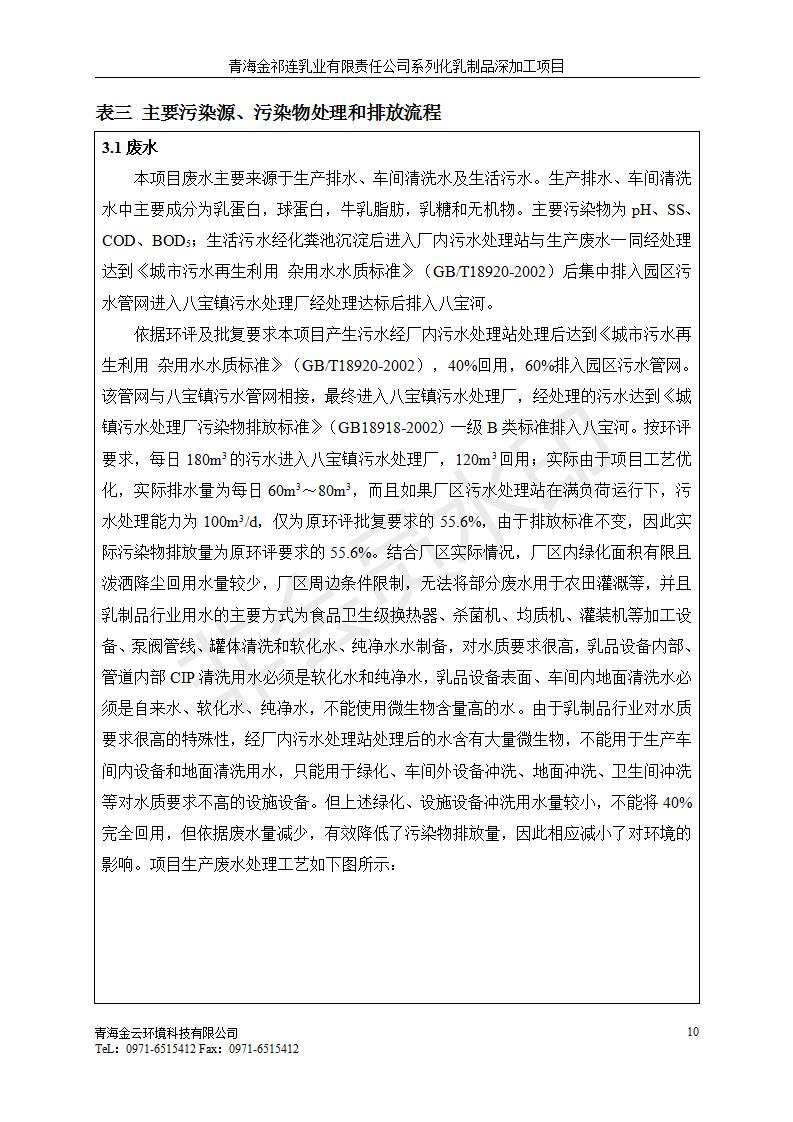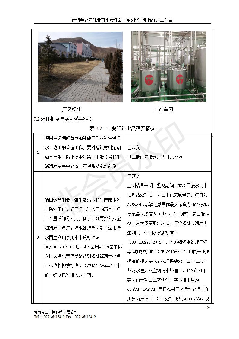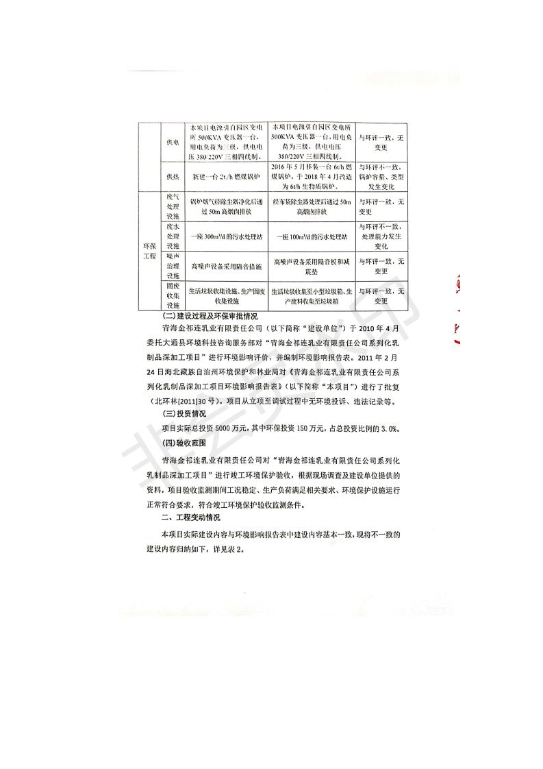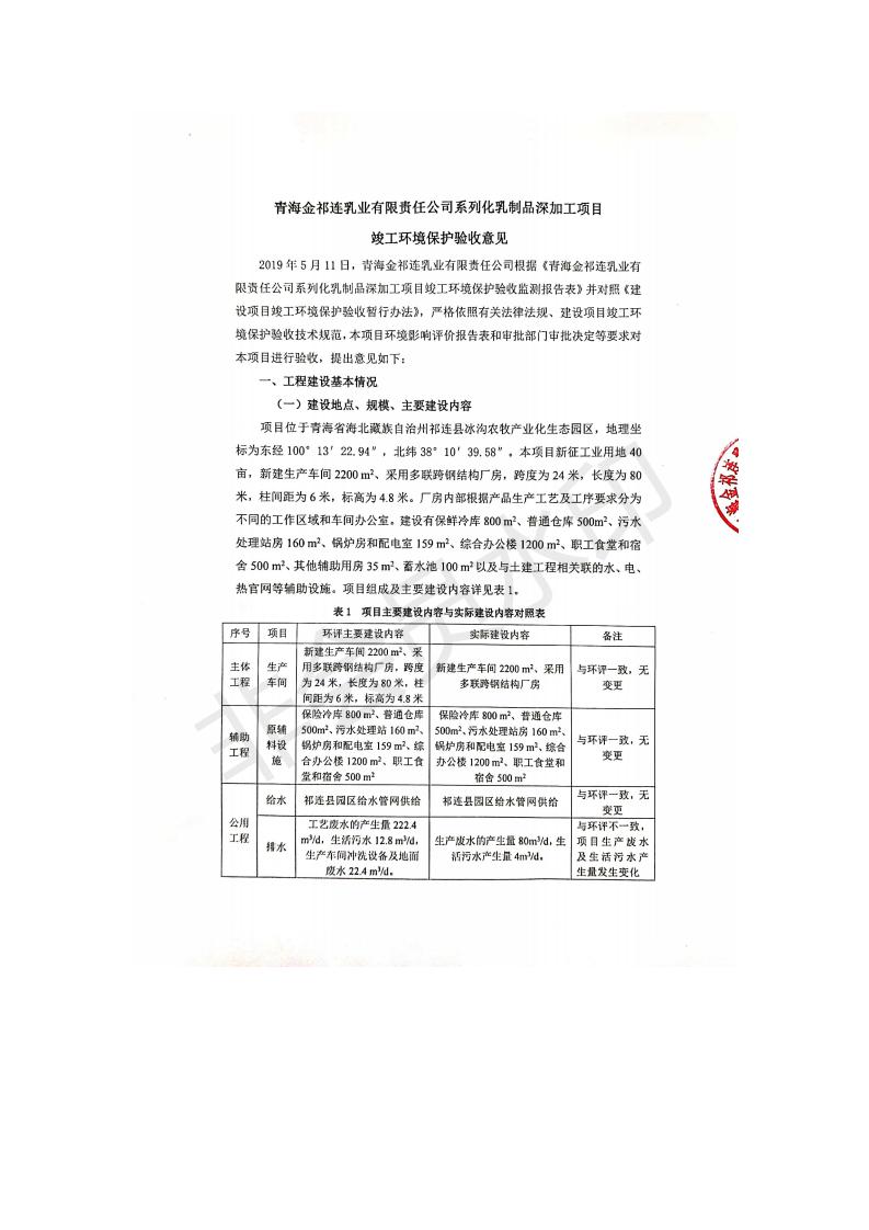 根據(jù)中華人民共和國國務院令第682號《國務院關于修改〈建設項目環(huán)境保護管理條例〉的決定》和《建設項目竣工環(huán)境保護驗收暫行辦法》(國務院令682號),青海金祁連乳業(yè)有限責任公司系列化乳制品深加工項目(包括竣工環(huán)境保護驗收監(jiān)測報告表和驗收意見)公示如下。 一、項目名稱:青海金祁連乳業(yè)有限責任公司系列化乳制品深加工項目 二、地點:海北藏族自治州祁連縣冰溝農(nóng)牧產(chǎn)業(yè)化生態(tài)園區(qū) 三、建設單位:青海金祁連乳業(yè)有限責任公司 四、建設內(nèi)容:本項目新征工業(yè)用地40畝,新建生產(chǎn)車間2200 m2、采用多聯(lián)跨鋼結構廠房,跨度為24米,長度為80米,柱間距為6米,標高為4.8米。廠房內(nèi)部根據(jù)產(chǎn)品生產(chǎn)工藝及工序要求分為不同的工作區(qū)域和車間辦公室。建設有保鮮冷庫800 m2、普通倉庫500m2、污水處理站房160 m2、鍋爐房和配電室159 m2、綜合辦公樓1200 m2、職工食堂和宿舍500 m2、其他輔助用房35 m2、蓄水池100 m2以及與土建工程相關聯(lián)的水、電、熱官網(wǎng)等輔助設施。 五、聯(lián)系人:張工 六、聯(lián)系電 話:0971-6515411 七、公示時間:二〇一九年七月十日至二〇一九年八月六日 公示期間,對上述公示內(nèi)容如有異議,請以書面形式反饋,個人須署真實姓名,單位須加蓋公章。