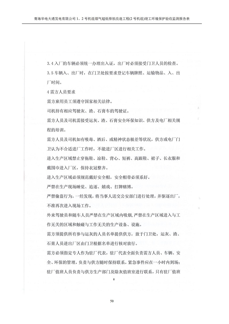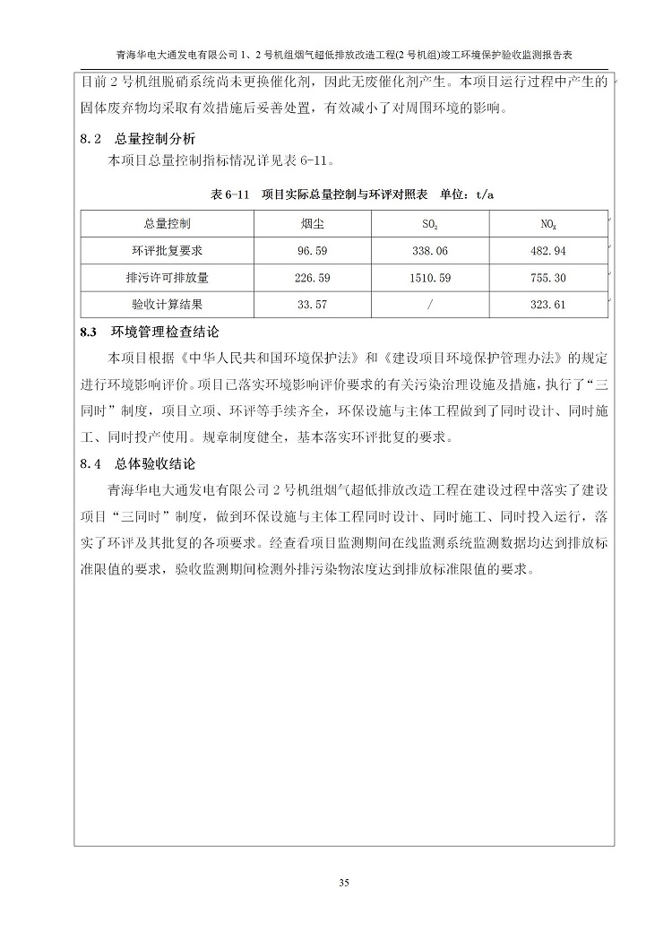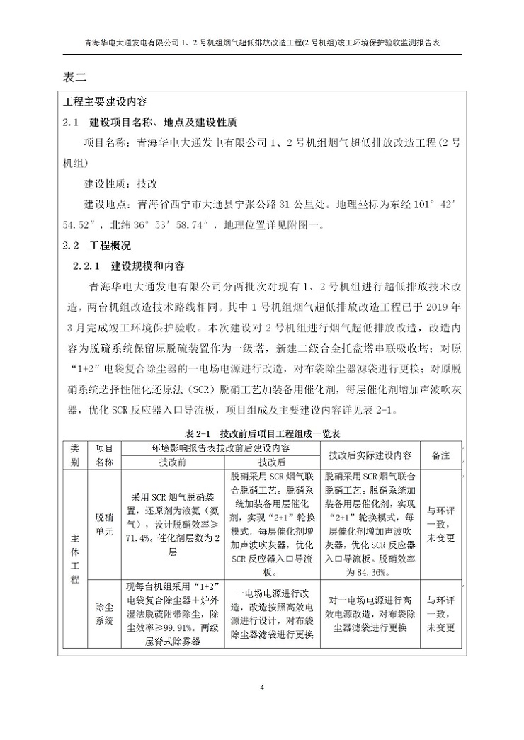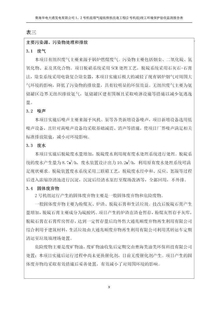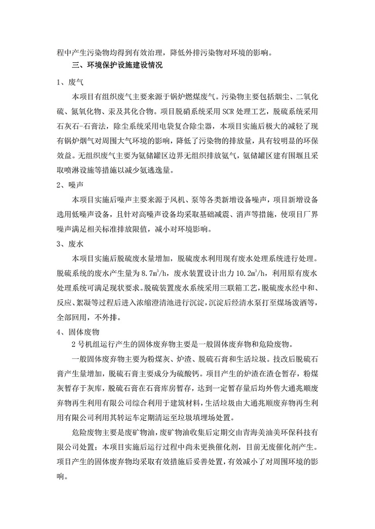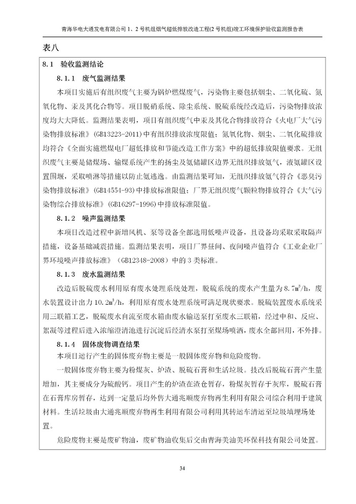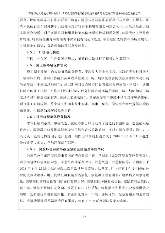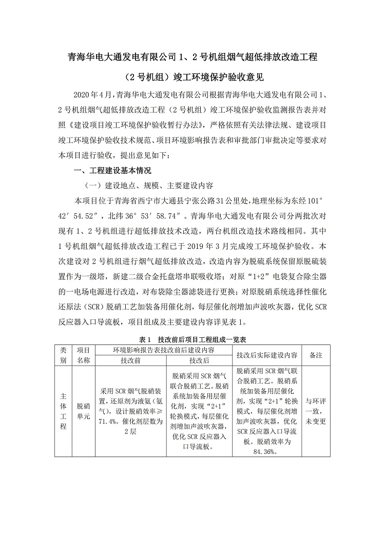 根據(jù)中華人民共和國(guó)國(guó)務(wù)院令第682號(hào)《國(guó)務(wù)院關(guān)于修改〈建設(shè)項(xiàng)目環(huán)境保護(hù)管理?xiàng)l例〉的決定》和《建設(shè)項(xiàng)目竣工環(huán)境保護(hù)驗(yàn)收暫行辦法》(國(guó)務(wù)院令682號(hào)),青海華電大通發(fā)電有限公司1、2號(hào)機(jī)組煙氣超低排放改造工程(2號(hào)機(jī)組) (包括竣工環(huán)境保護(hù)驗(yàn)收監(jiān)測(cè)報(bào)告表和驗(yàn)收意見)公示如下。 一、項(xiàng)目名稱:青海華電大通發(fā)電有限公司1、2號(hào)機(jī)組煙氣超低排放改造工程(2號(hào)機(jī)組) 竣工環(huán)境保護(hù)驗(yàn)收監(jiān)測(cè)報(bào)告表 二、地點(diǎn):青海省西寧市大通縣寧張公路31公里處 三、建設(shè)單位:青海華電大通發(fā)電有限公司 四、建設(shè)內(nèi)容:2號(hào)機(jī)組煙氣超低排放改造,2號(hào)機(jī)組改造內(nèi)容為脫硫系統(tǒng)保留原脫硫裝置作為一級(jí)塔,新建二級(jí)合金托盤塔串聯(lián)吸收塔;對(duì)原“1+2”電袋復(fù)合除塵器的一電場(chǎng)電源進(jìn)行改造,對(duì)布袋除塵器濾袋進(jìn)行更換;對(duì)原脫硝系統(tǒng)選擇性催化還原法(SCR)脫硝工藝加裝備用催化劑,每層催化劑增加聲波吹灰器,優(yōu)化SCR反應(yīng)器入口導(dǎo)流板。 五、聯(lián)系人:馬世敏 六、聯(lián)系電 話:0971-6515411 七、公示時(shí)間:二〇二〇年四月二十九日至二〇二〇年五月二十八日 公示期間,對(duì)上述公示內(nèi)容如有異議,請(qǐng)以書面形式反饋,個(gè)人須署真實(shí)姓名,單位須加蓋公章。
